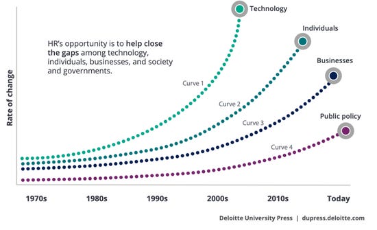 Technologie entwickelt sich schneller als Individuen sie adoptieren können. Individuen adaptieren schneller als Organisationen sich anpassen können. Und Organisationen passen sich schneller an als regulatorische Rahmenbedingungen folgen können.