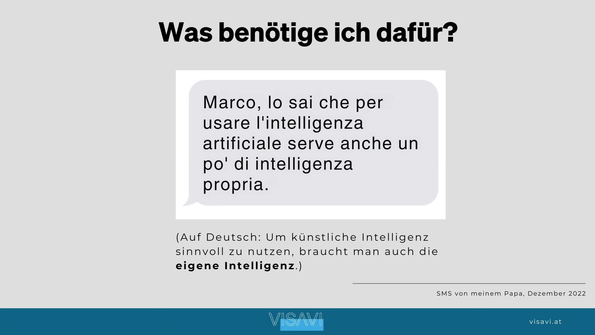 Mein Vater hat mir schon relativ früh nach der Einführung von ChatGPT geschrieben: „Marco, für die Benutzung dieser Tools braucht es eine Portion eigene Intelligenz.” Ich würde es eher so sagen: Es braucht eine Portion EIGEN. Eigene Intelligenz, eigene Neugierde, eigene Motivation und vor allem eigene Fähigkeiten.