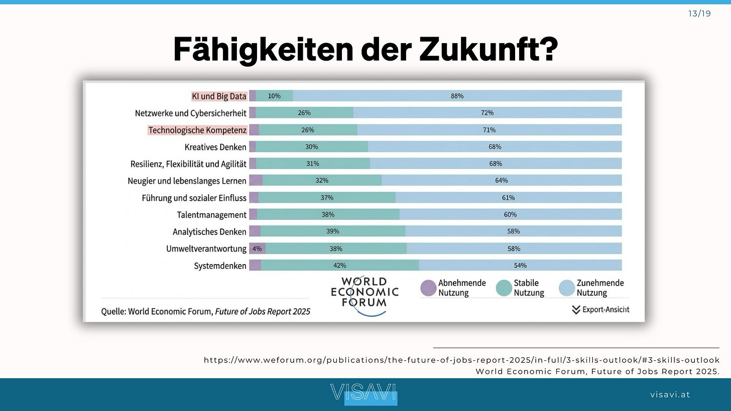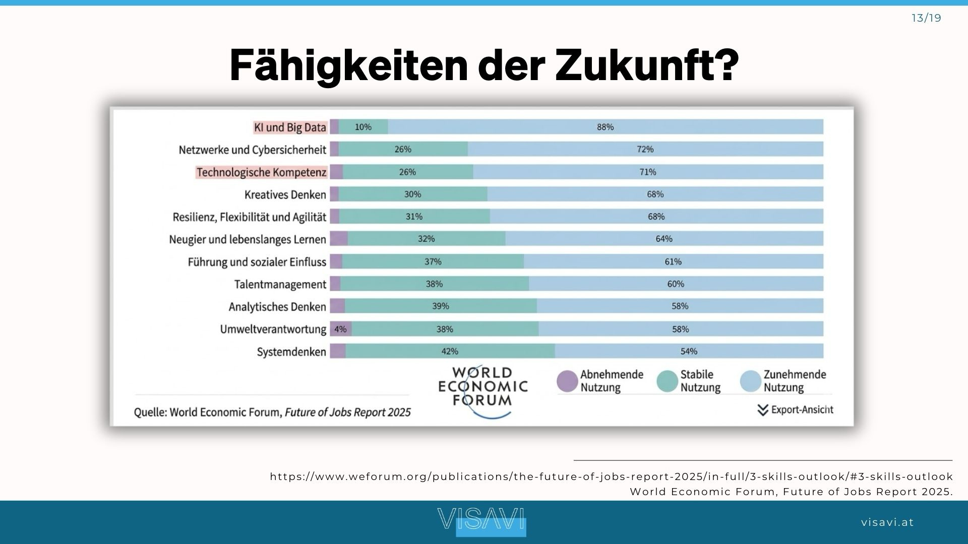 Das Weltwirtschaftsforum veröffentlicht alle paar Jahre einen grossartigen Bericht darüber, welche Fähigkeiten in Zukunft gebraucht werden, den Future of Jobs Report (WEF, 2025). Und naja, wenig überraschend stehen KI, Big Data und technologische Kompetenz auf den oberen Plätzen. Aber darum geht es mir hier gar nicht primär. Was der Report wirklich zeigt, ist die schiere Vielfalt der Fähigkeiten, die immer wichtiger werden: kreatives Denken, Resilienz, Flexibilität, Neugierde, lebenslanges Lernen. Es ist eben nicht mehr die eine Kompetenz, die zählt. Es sind viele und sie werden quer über Rollen und Branchen gebraucht.