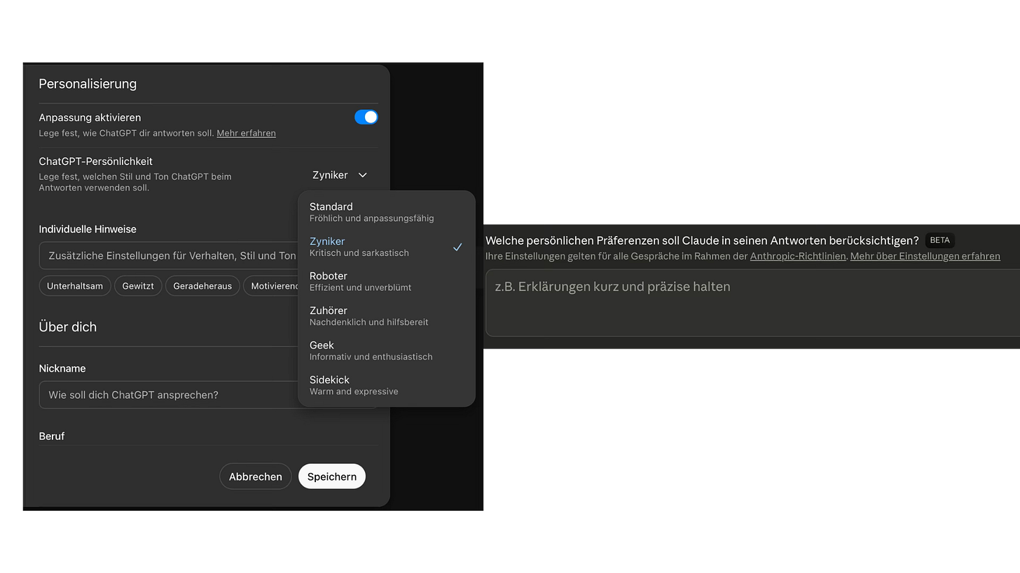 Ihr könnt in ChatGPT oder Claude das Grundverhalten anpassen. Zum Beispiel lässt sich vorab festlegen, dass die KI kritisch sein soll, Annahmen hinterfragen und nicht automatisch zustimmen. Das kann man entweder direkt in den Custom Instructions (z. B. in ChatGPT unter Einstellungen) hinterlegen oder einfach gleich in den (System) Prompt schreiben. Diese Einstellungen sind keine Garantie, aber sie helfen spürbar, Sycophancy abzuschwächen und bessere Rückmeldungen zu bekommen.